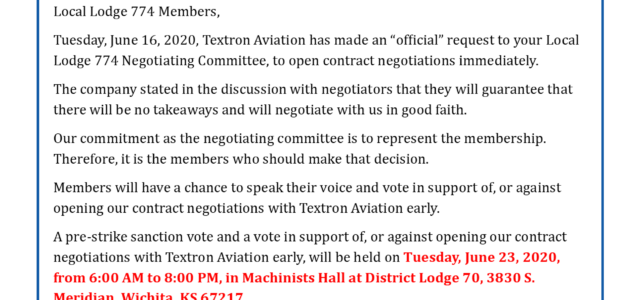 ⚠️ Breaking News from your Local 774 Negotiating Committee Textron Aviation officially requests to open contract negotiations early. Please follow and like us: