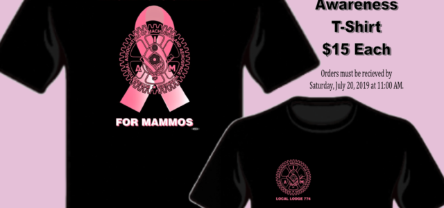 For a limited time you can order a Local Lodge 774 Breast Cancer Awareness shirt. Your order must be placed by 11:00 AM, Saturday, July 20, 2019! Call Kim Fedd @ 316-207-2212, or come to the Local 774 membership meeting this Saturday, July 20, 2019, at 10:00 AM to place your order!