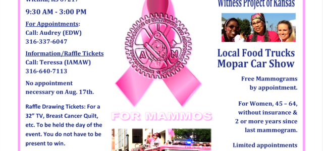 Machinists United for Mammos…A Breast Cancer Awareness Event, Car show, Food Trucks, and Raffle Drawings on Saturday, August 17th 9:30 AM – 3:00 PM at Machinists Hall, 3830 S. Meridian, Wichita, KS 67217. 10 FREE Raffle tickets will be given to everyone who receives a mammogram at the event on August 17, 2019. For more information, call Teressa @ 316-640-7113
