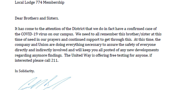 Please be advised: A letter from President/Directing Business Representative, Cornell Beard regarding a confirmed positive case of COVID-19 at Textron Aviation.
