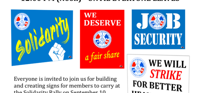 The event will be held at the District Lodge 70 office on Tuesday, September 8, 2020, from 12:00 PM (Noon) until everyone leaves. Stay however long you wish to help us build and create signs for the Solidarity Rally on Thursday, September 10th.