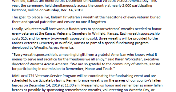 IAM Local Lodge 774 Veterans Service Program is asking you to help us Remember, Honor, and Teach on Saturday, December 14, 2019, at 11:00 AM by sponsoring a wreath, volunteering, or inviting friends to help. All sponsorships must be turned in by December 2, 2019. https://www.wreathsacrossamerica.org/pages/162252